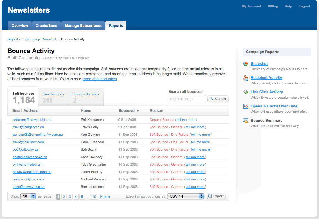 As well as automatically processing any bounced emails for you, we also tell you exactly why that subscriber bounced out of your list. Maybe we got an out of office reply, or perhaps their mailbox was full - whatever the reason, they didn’t get your email and we’ll tell you why.