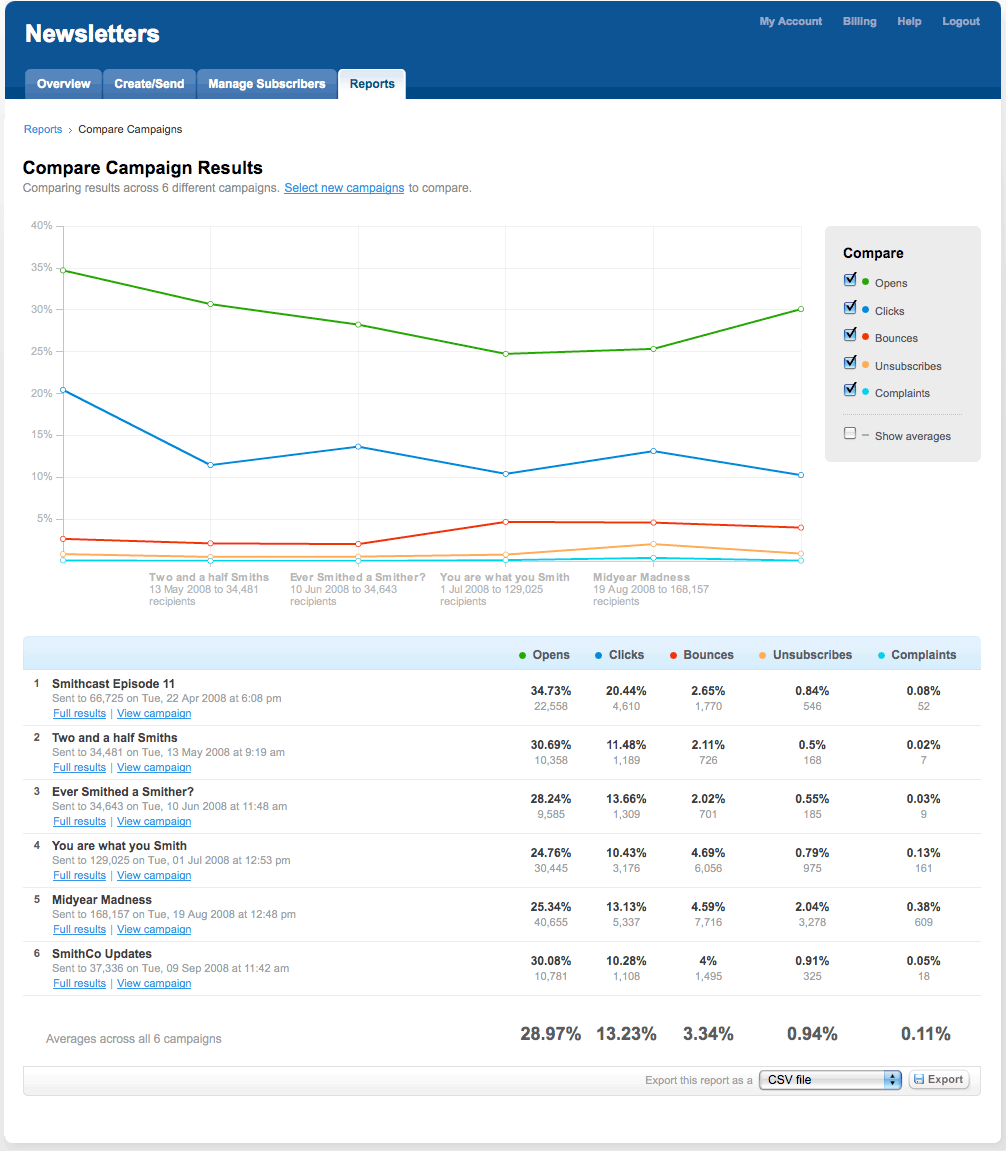 Easily compare any of your email campaign with each other. Is your open rate improving? Are you seeing less bounces over time?